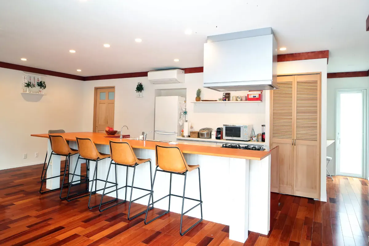 ご依頼主の奥様が家造りをする上で一番こだわった「アイランドキッチン」は、向きや導線を計算し、使いやすさ重視の設計になっています。キッチンを囲むカウンターに座ってリビング全体を見回しながら飲むコーヒーは格別と喜んでおられました。
