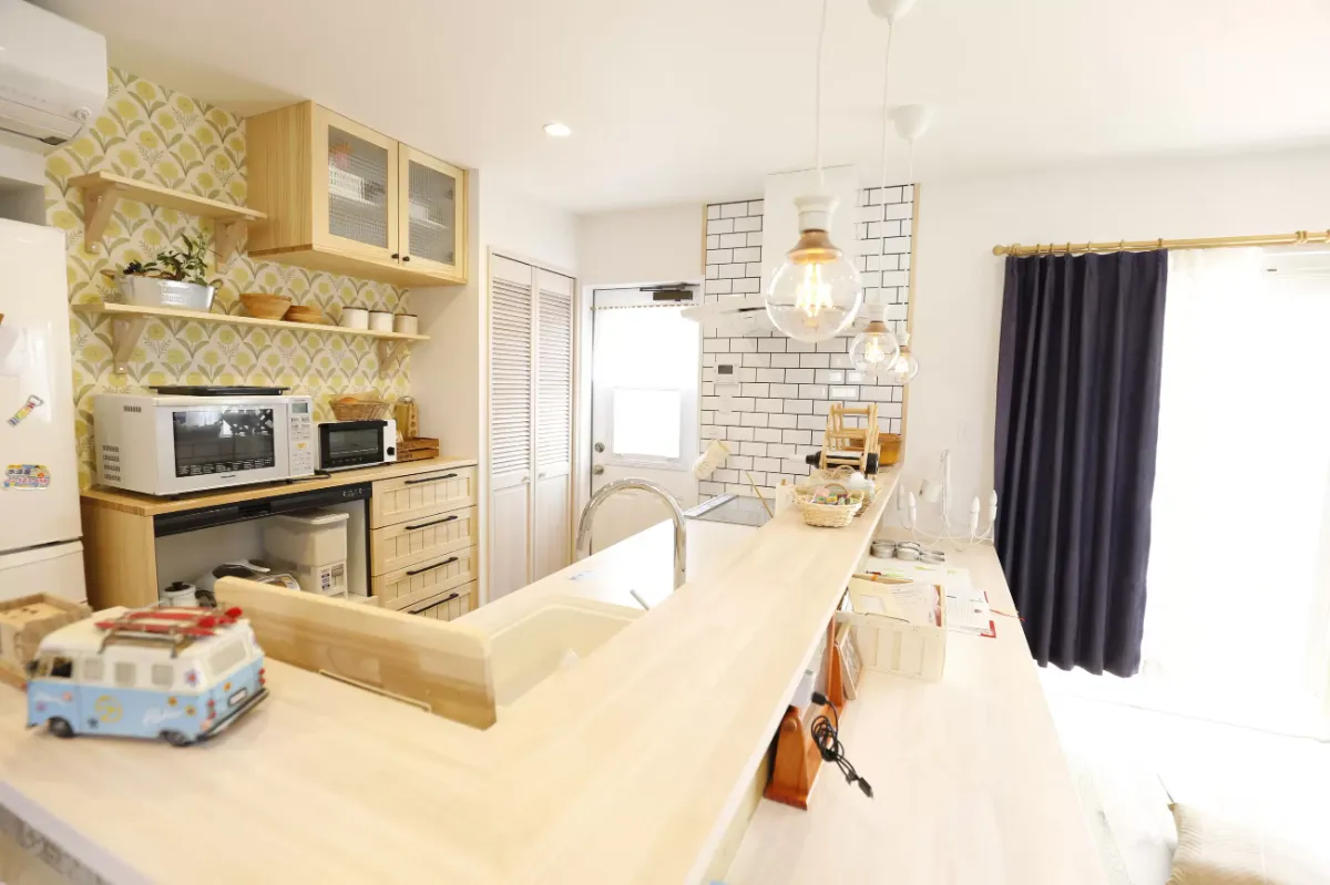 細かい導線や使い勝手を良くしたこだわりのキッチン。面倒な家事を少しでも楽しくできたら…という想いから、装飾のタイルや小物、ライトなどご依頼主の奥様の好みを随所に盛り込みました。 家に訪れた友達皆から褒められたそうで、大変喜ばれておりました。