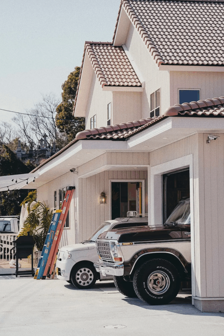 佇まいも壮観な2つのガレージは家族みんなが雨の日も濡れずに家の中へ出入りするためのもの。