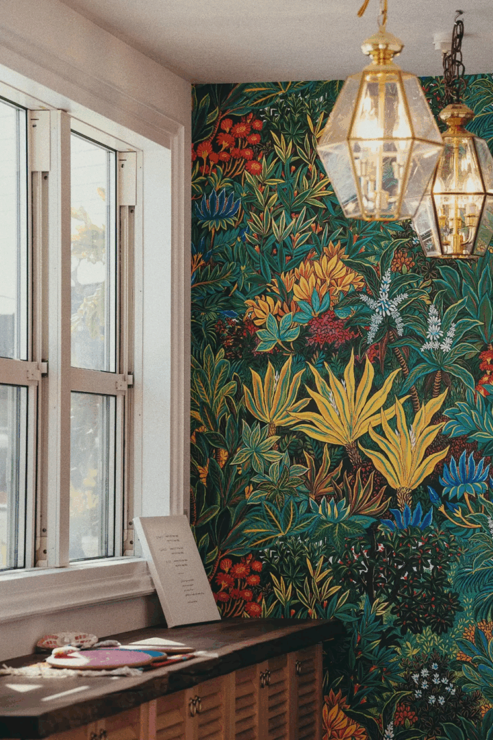 ご夫婦が大好きなハワイのモチーフが家のいたるところにさりげなく散りばめられています。家族をはじめ訪問者を明るく迎え入れるエントランスには、オールドハワイアンを思わせるボタニカル柄の壁紙を採用。鮮やかながら落ち着いた緑に、ダークブラウンのヘリンボーン床のコントラストが映えます。シューズボックスは、サニースポットによるオーダーメイドで作成いたしました。