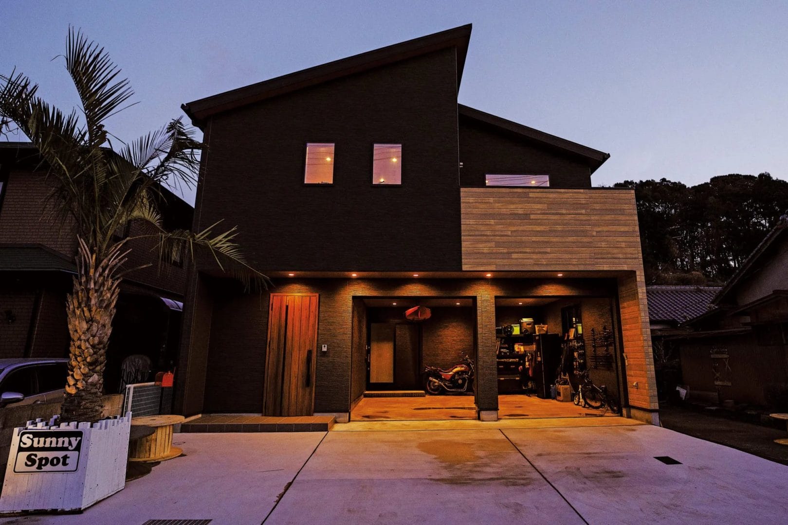 ダークグレイと木目調を組み合わせた外観は、オート点灯のスポットライトを仕込み、日が沈むとさらにシックな佇まいに。椰子の木は熊本のエクステリアチーム『sabana』によるものです。