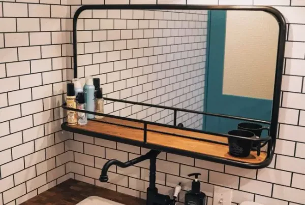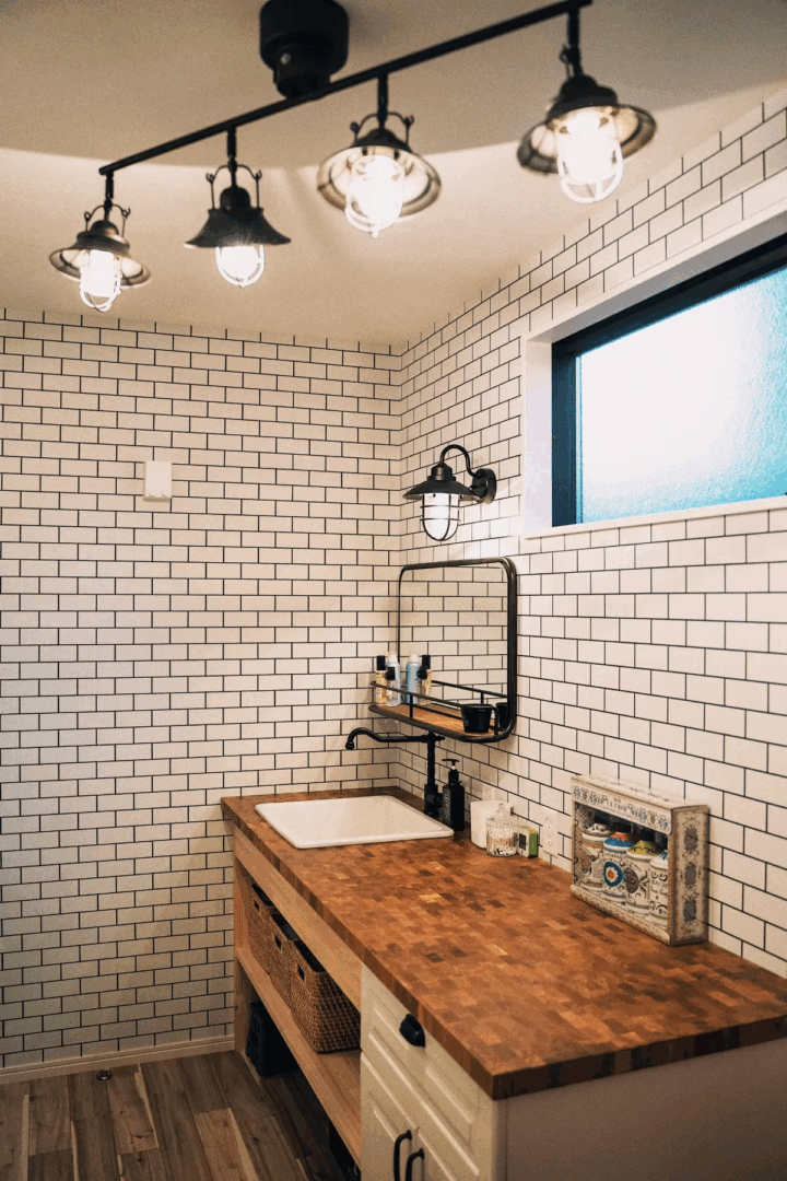 CRUSH GATEのジャッカルミラーを主役に、天板やシンクを組み合わせた洗面台。タイルや照明、木材を調和させてNYのカフェやホテルを思わせる洗練された空間に仕上がりました。