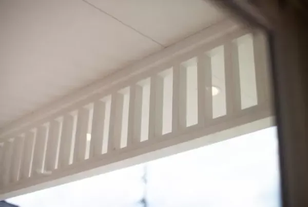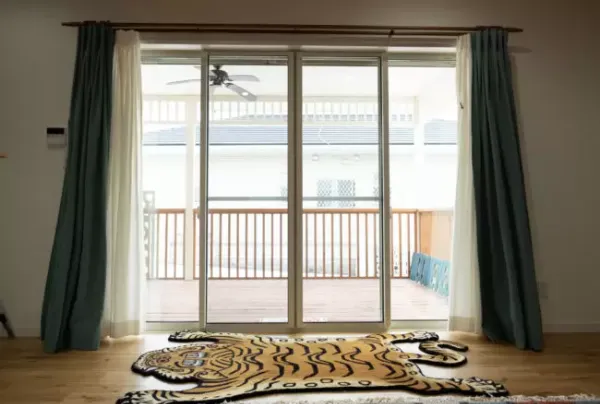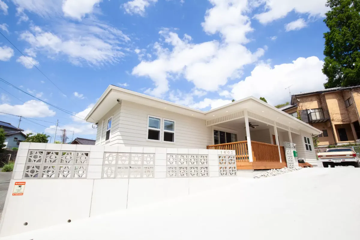 両サイドにふんだんに使用した花ブロックがご家族や訪れた人を迎える外構アプローチ。花ブロック(沖縄から直輸入)はよく使わせていただいてますが、これまでのお家で最も多く使用したケースとなりました。家全体にビンテージアメリカンな表情をもたらす、グリーンの屋根は奥さまによる選定。ここの外観を他のお客さまに見せると、グリーンに惹かれる方が多いです。家の顔ともいえる玄関ドアは、断熱・気密・遮音にも優れた北欧生まれのものです。