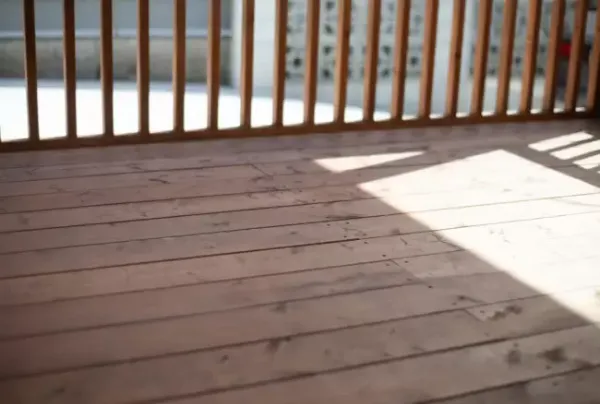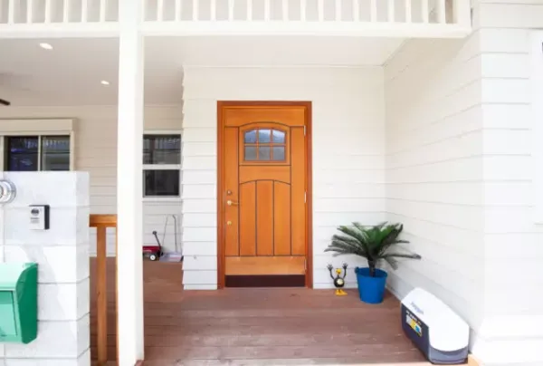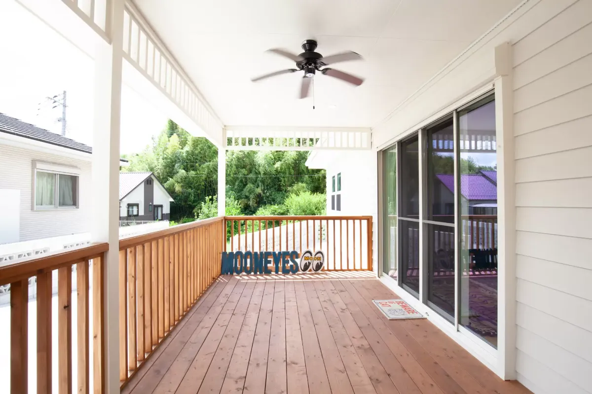 第2のリビングとして機能するウッドデッキは、玄関屋根からひと続きのカバードポーチスタイル。軒下には縦格子をあしらい、ここで小鳥たちが休憩する光景も見られるそうです。「MOONEYES」のサインボードは、奥さまによるDIY(!)