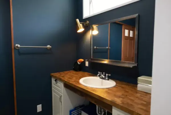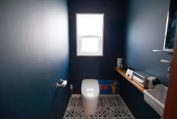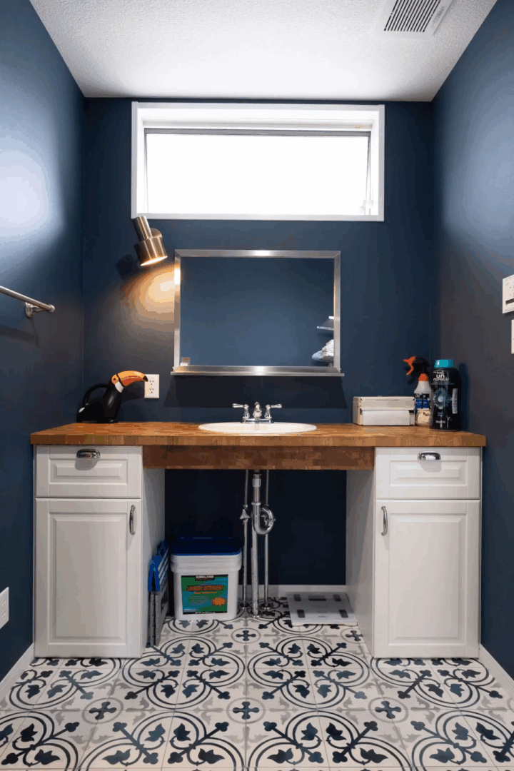 シックな佇まいのなかにポップさも兼ね備えたサニタリーとシンク。洗面台は造作です。濃いブルーのクロス、インダストリアルな鏡やライトのなかにポップなキャラクターやアイコンがセンスよく散りばめられ、アメリカンな空間に仕上がっています。 生活感が出がちな水回りですが、海外から取り寄せた洗剤のボックスを収納に使用するなど、絵になる空間づくりの参考になります。