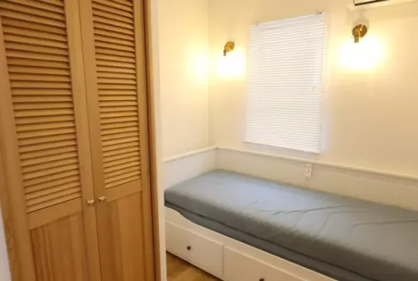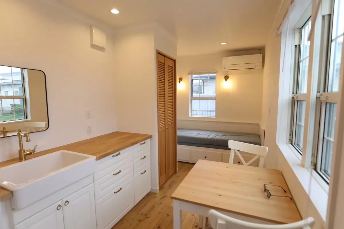 規定のサイズ内で、ご要望に応じた間取りで制作いたします。 こちらの事例では、キッチン・ベッドスペース・トイレのほか、下駄箱を含めた収納スペース、冷蔵庫を格納できるスペースも用意しています。