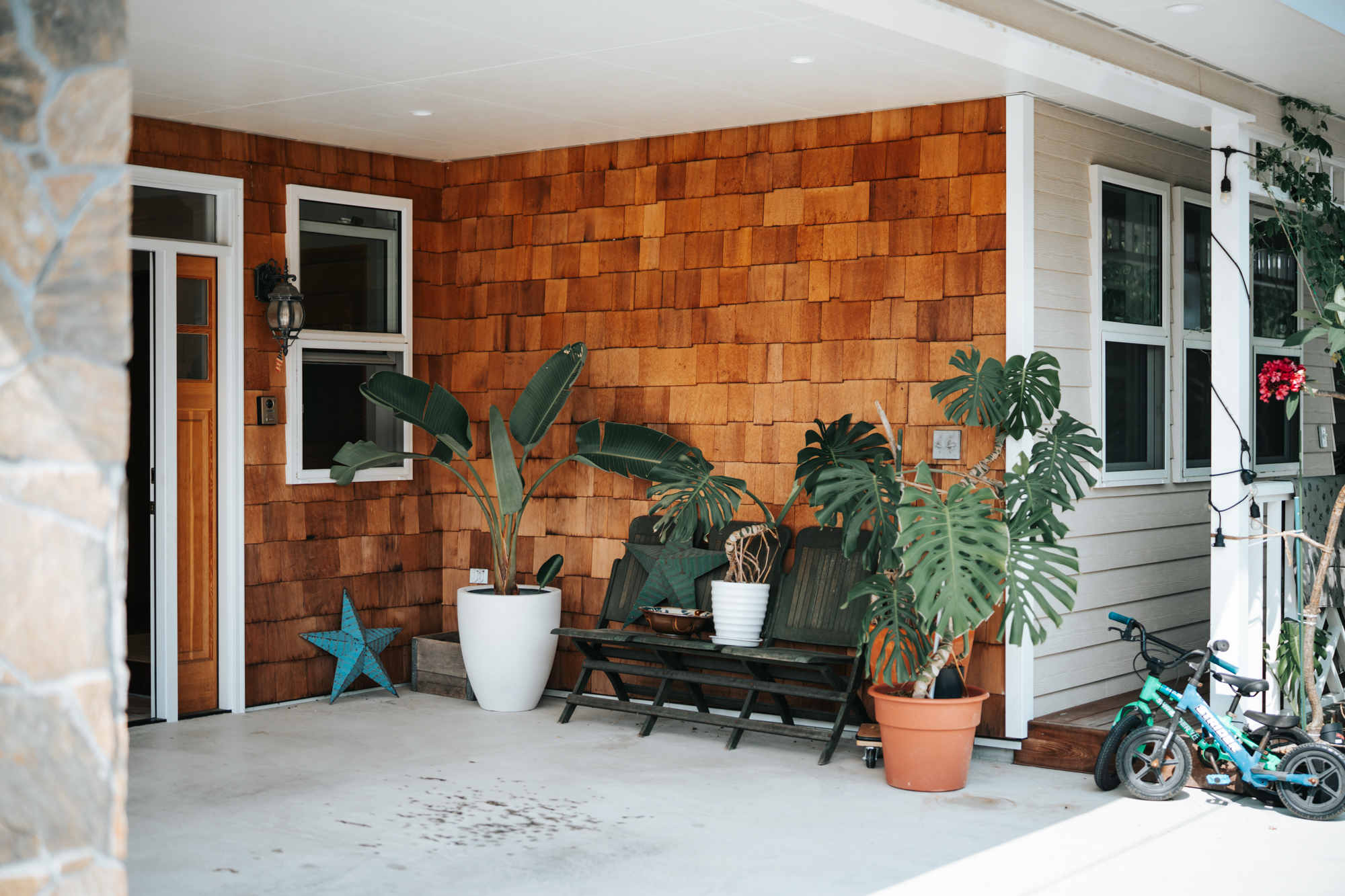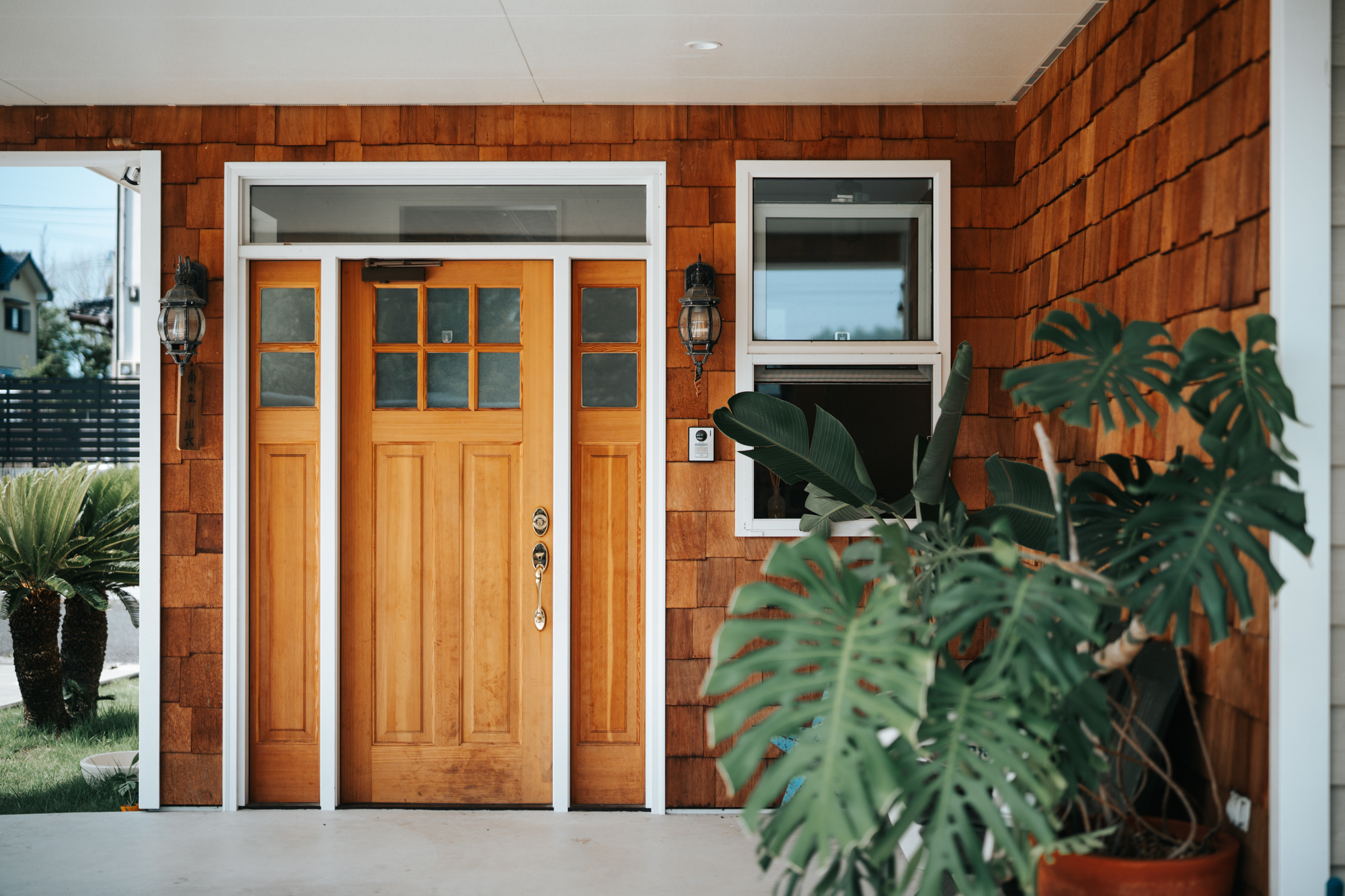 カバードポーチのエントランス外壁には、レッドシダーの鱗張りを採用。「南国リゾートハウス」や40’s〜70’s家具に合う家、とのオーダーを踏まえてご提案し、唯一無二のファサードに仕上がりました。雨の日でも濡れずに家の中にアクセスできる利便性も満たしています。