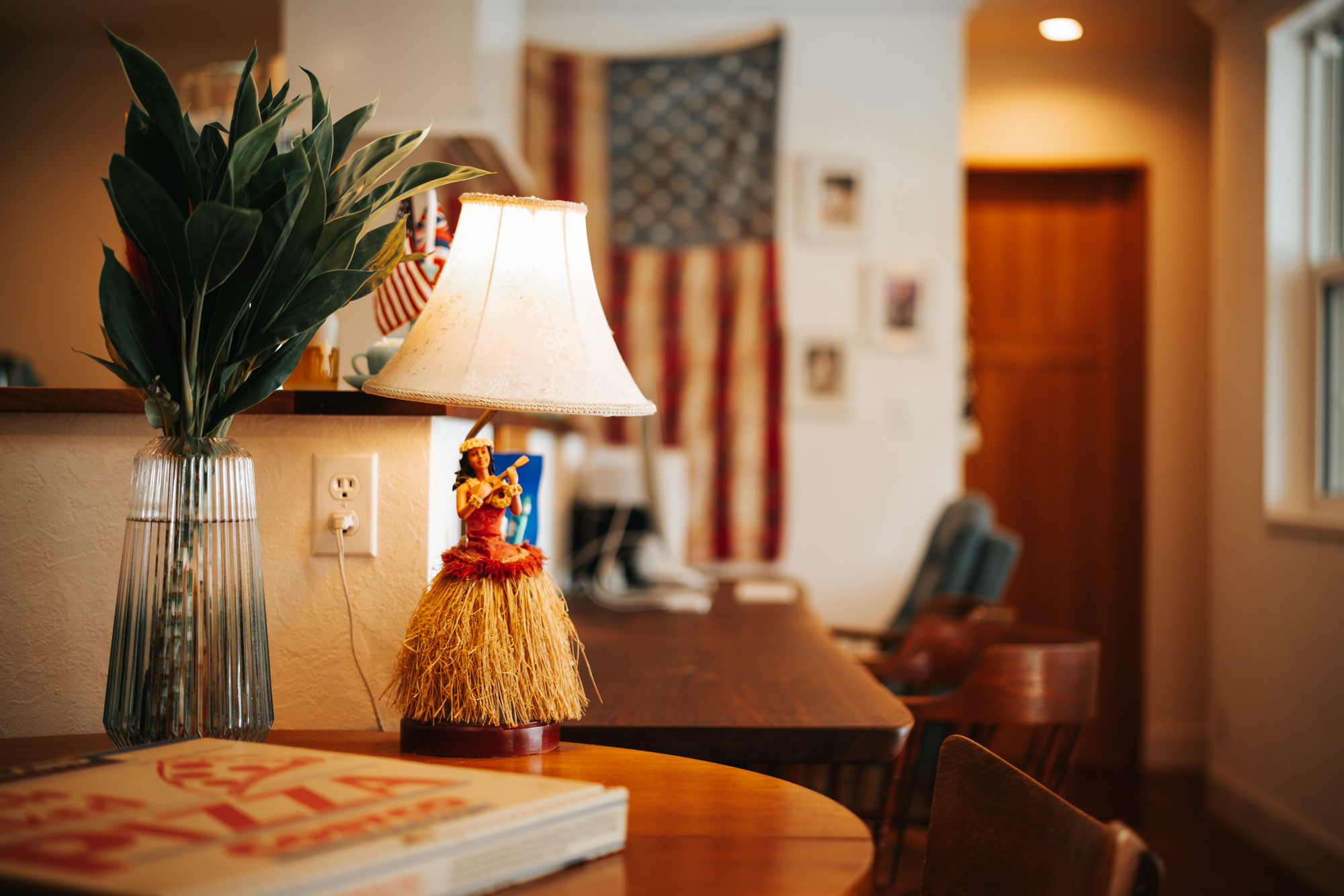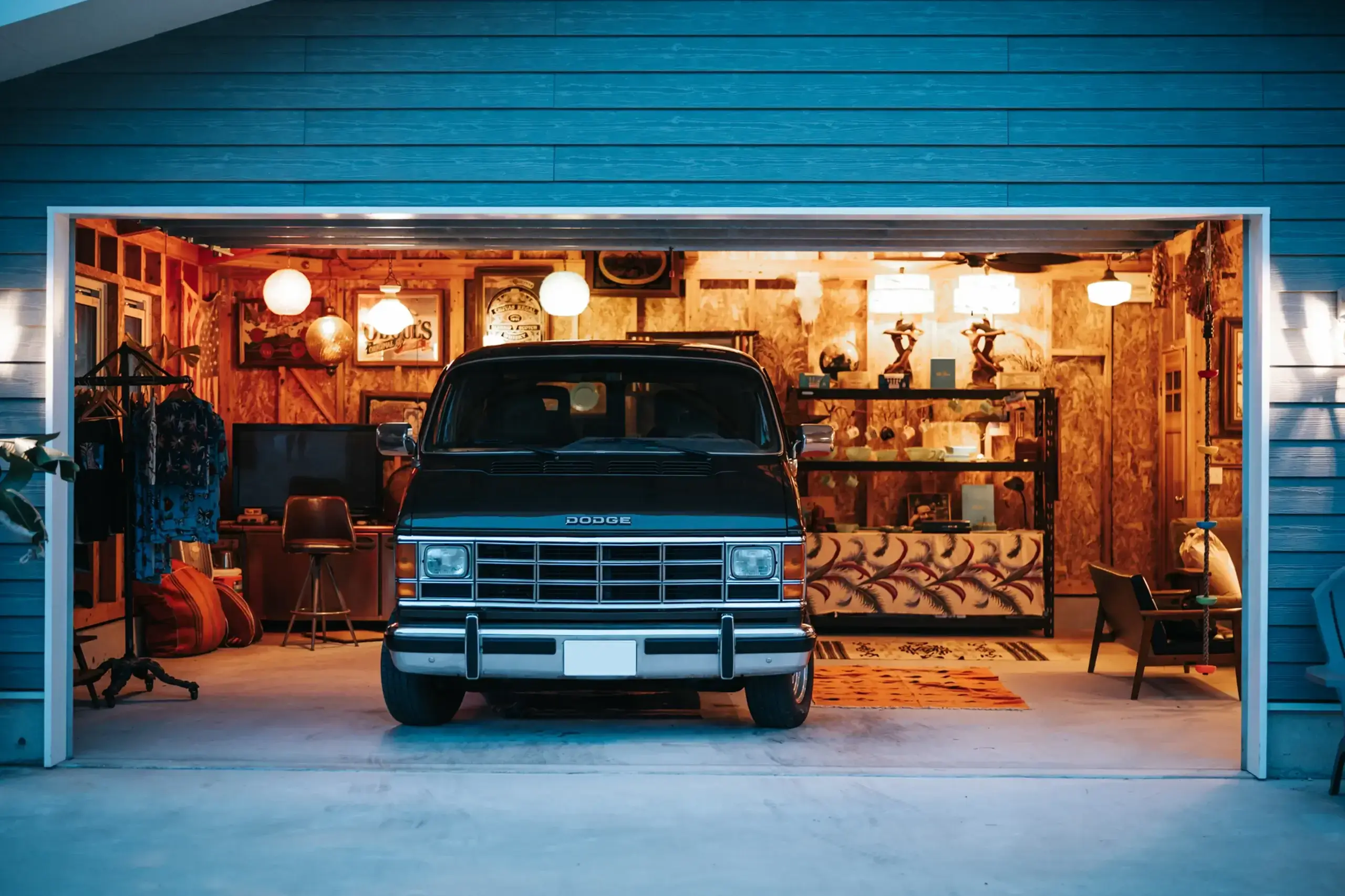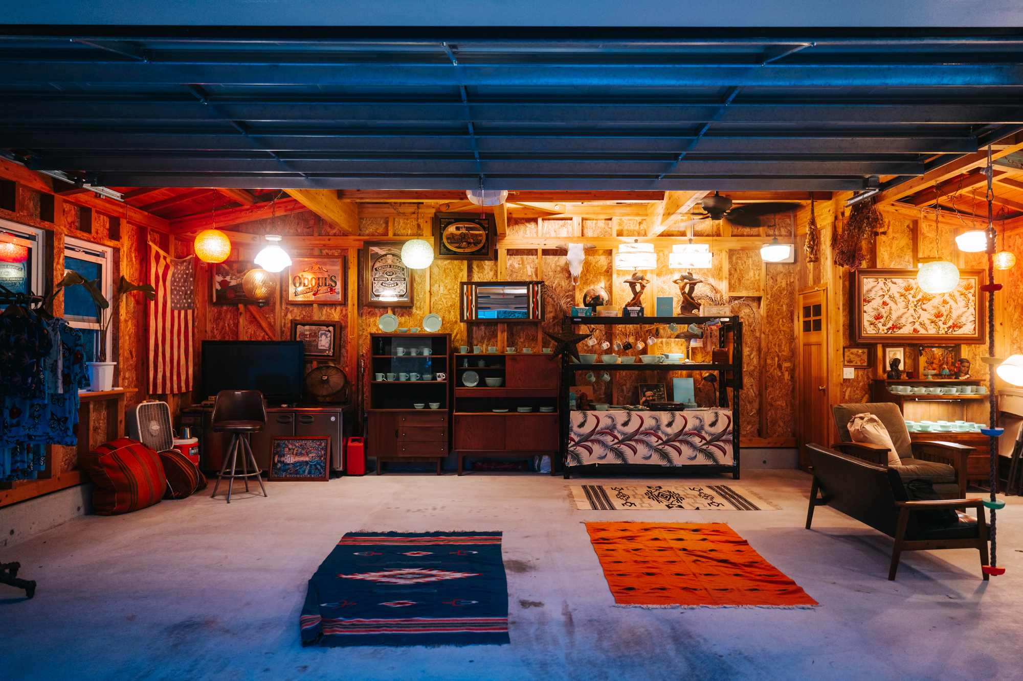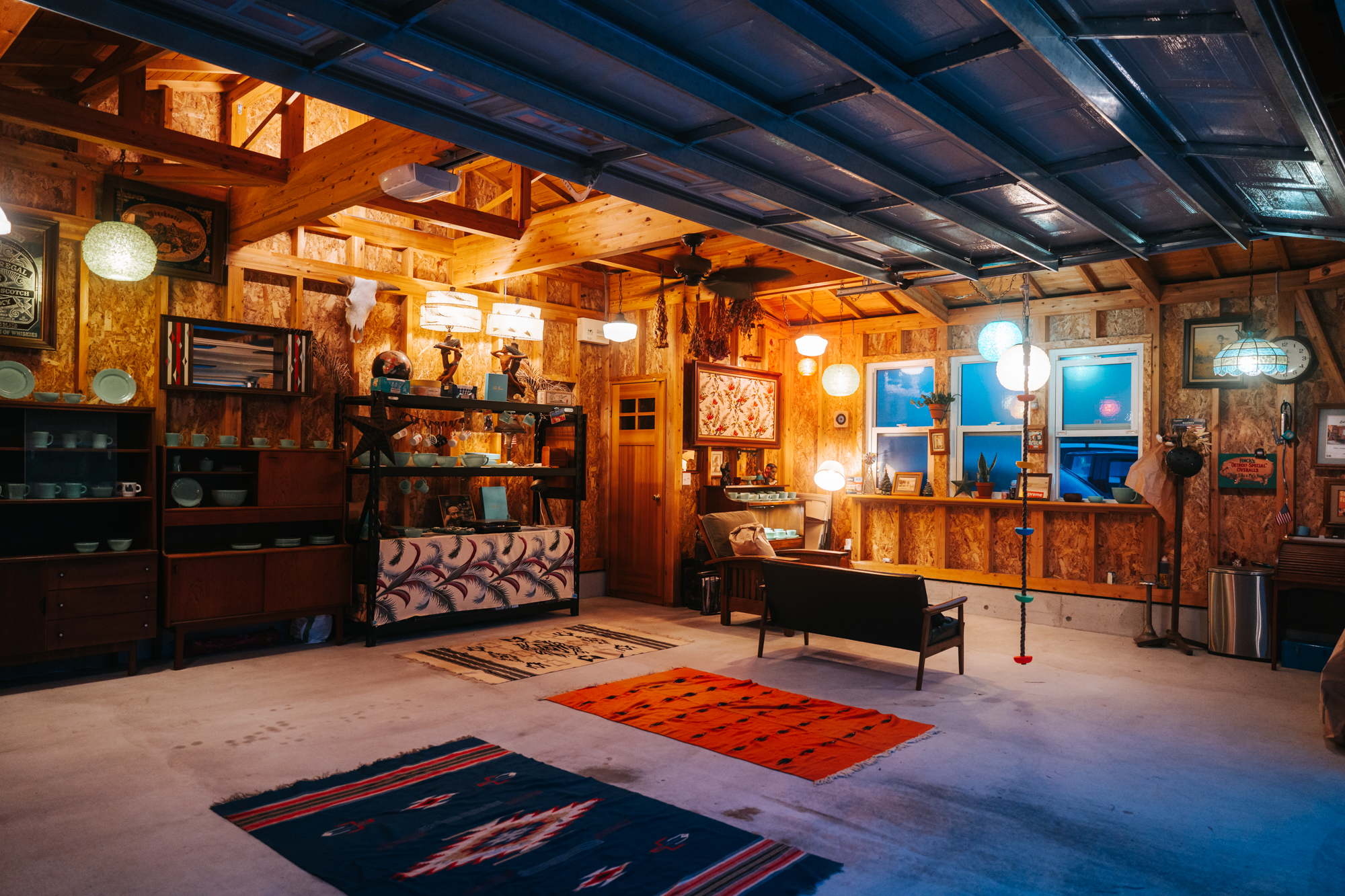 敷地内には独立したガレージを併設。「近い将来、地域のためのお店をできれば」とのご家族の展望を形にした空間で、ご主人のFire Kingコレクションや家具、ランプ、ミラーなどが並びすでにショップのような佇まい。大開口のオーバースライドシャッターが、アメリカンなムードを引き立てます。