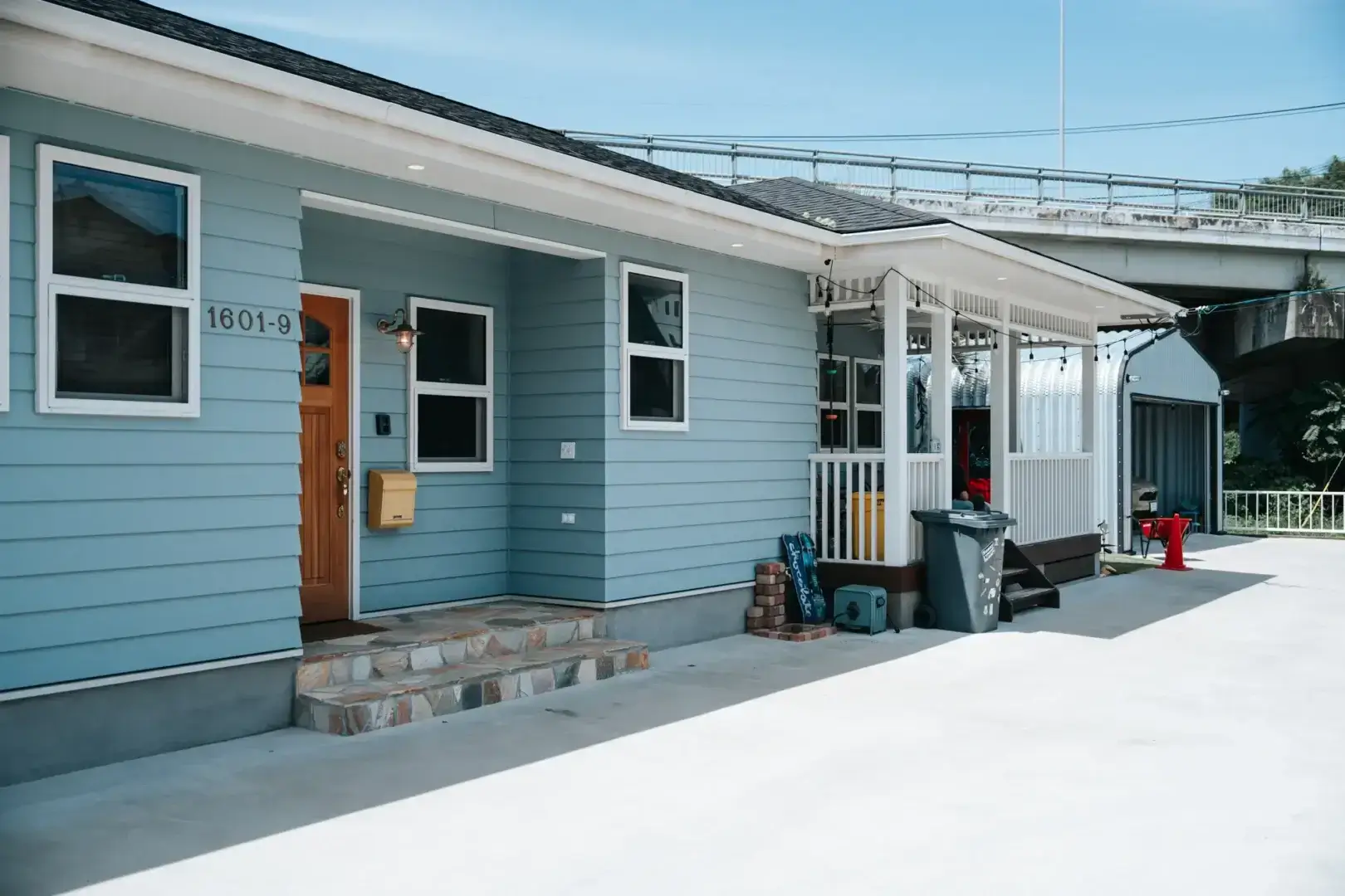 玄関まわりには、本物の石を使ったリアルストーン貼りと、マリンランプ。