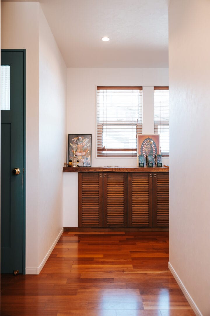 玄関を開けるとまず目に入るのは、飾り棚と造作のカウンター。