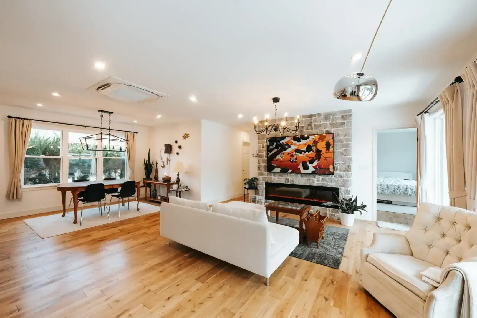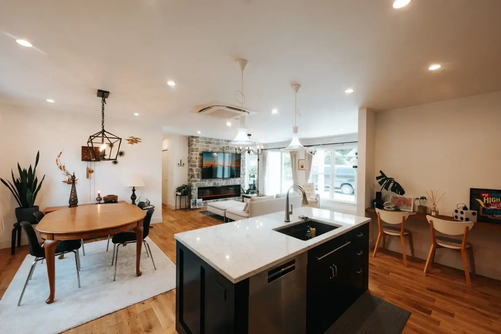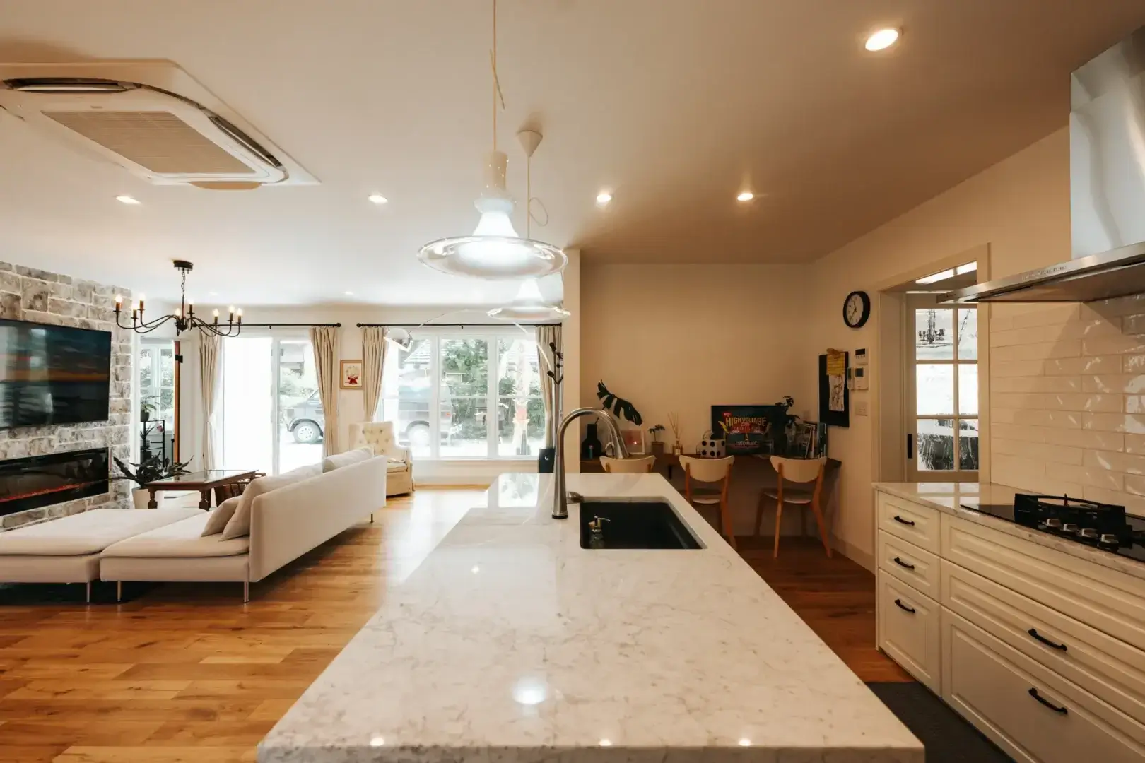 大きな窓から差し込む光に包まれ、ファイヤープレイスが心地よいぬくもりを添えます。