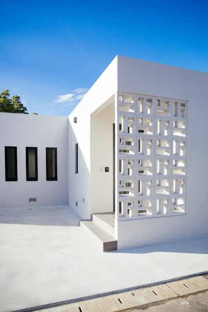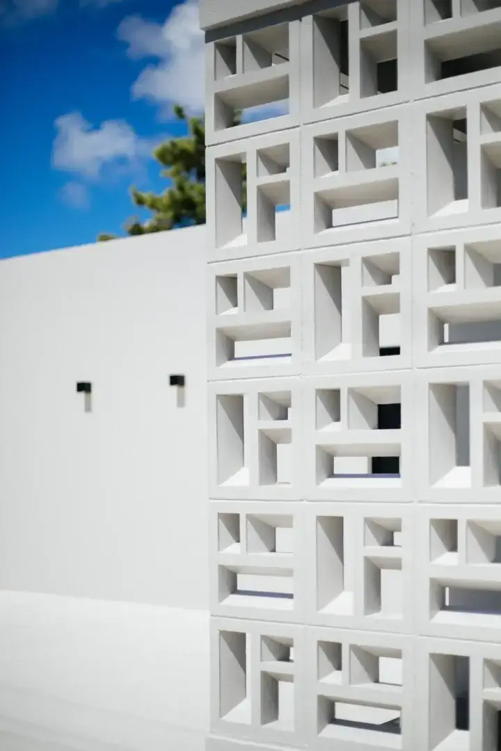 外観には沖縄の伝統的な意匠である“花ブロック”をアクセントとして取り入れています。