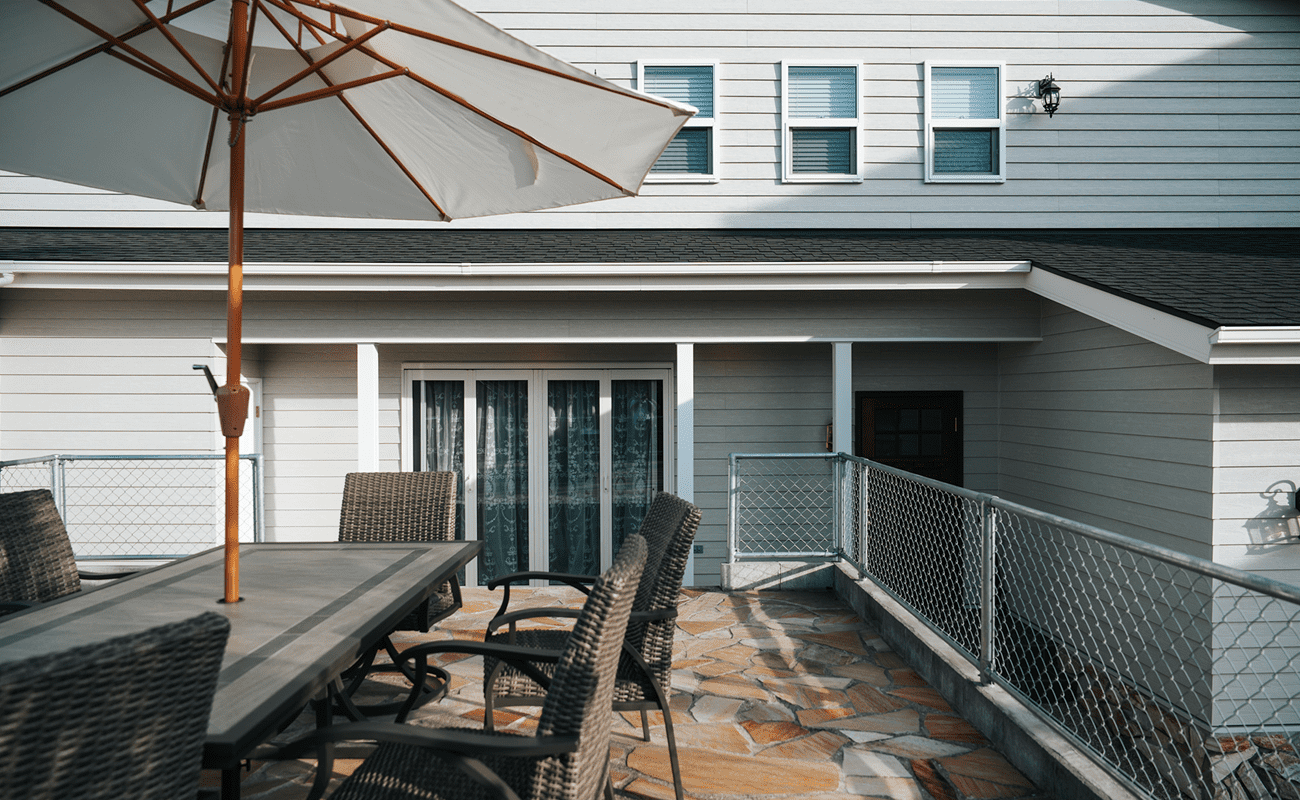 ウッドデッキで、庭が暮らしの主役に。朝食からBBQまで外ごはんが日常化。照明や庇、ガーデンシンクを合わせ、広い土地を“屋外リビング”としてお使いいただけます。